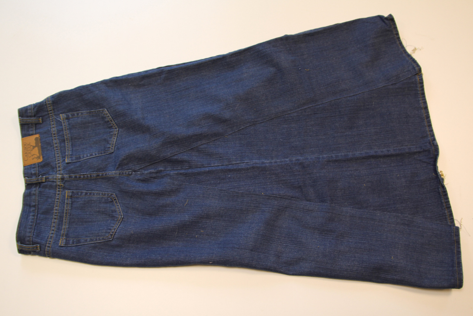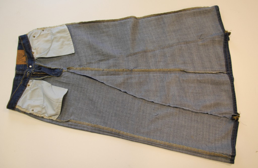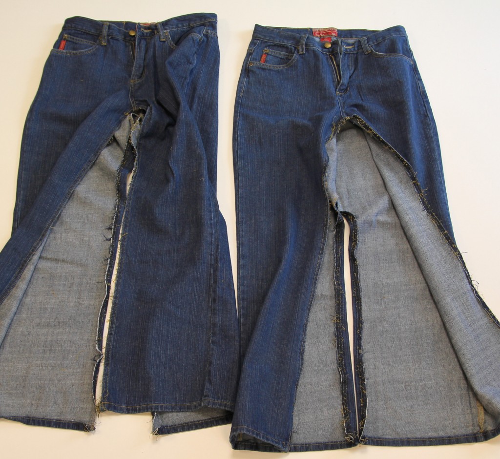 To begin you’ll need two pairs of jeans (if you want a fuller skirt boot cut jeans work well) the size that you want your skirt.
