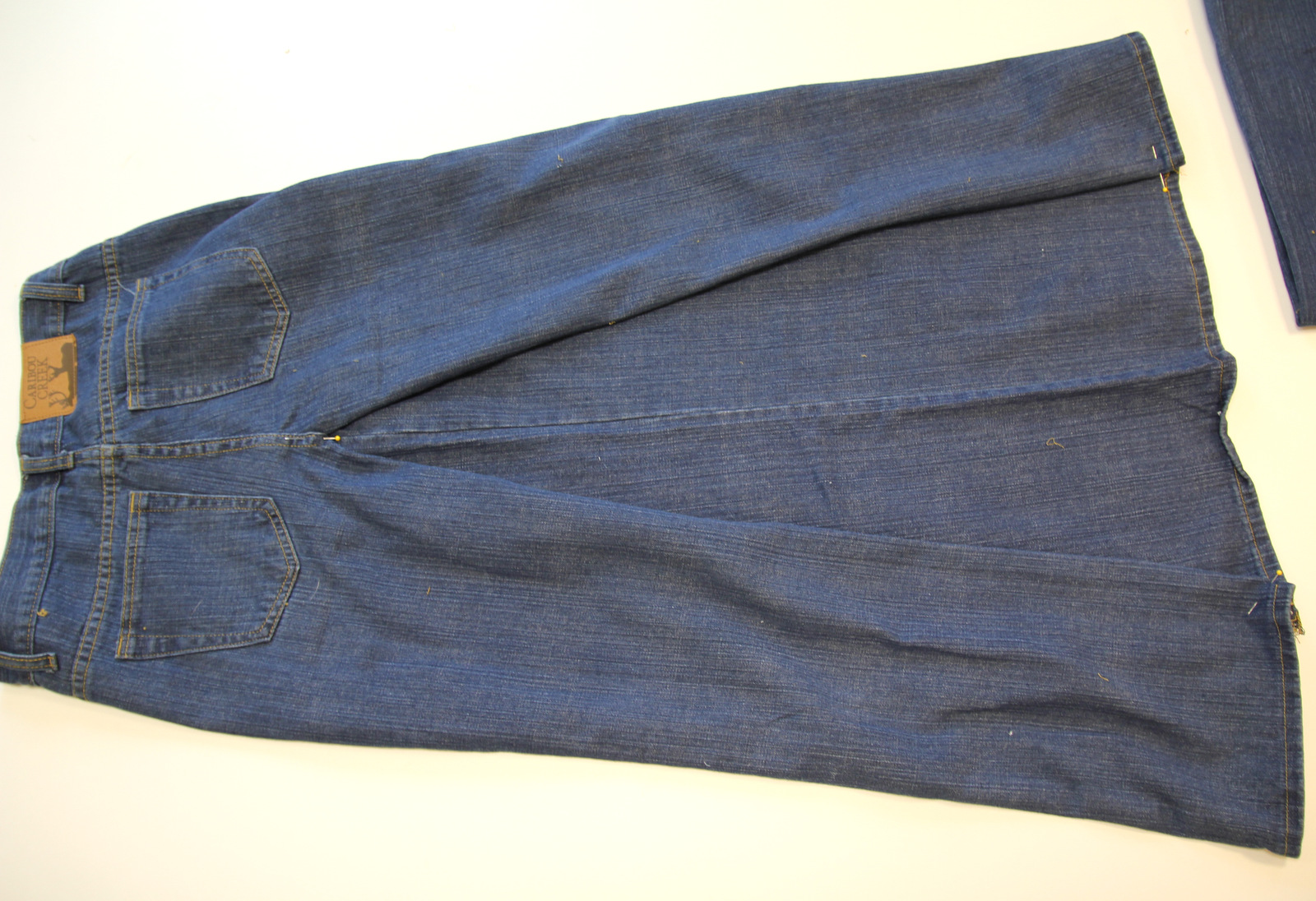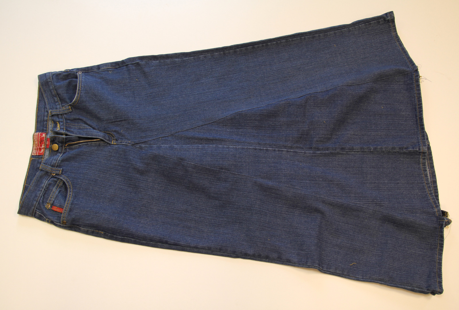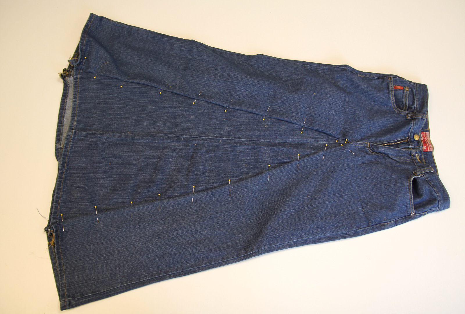 To begin you’ll need two pairs of jeans (if you want a fuller skirt boot cut jeans work well) the size that you want your skirt.