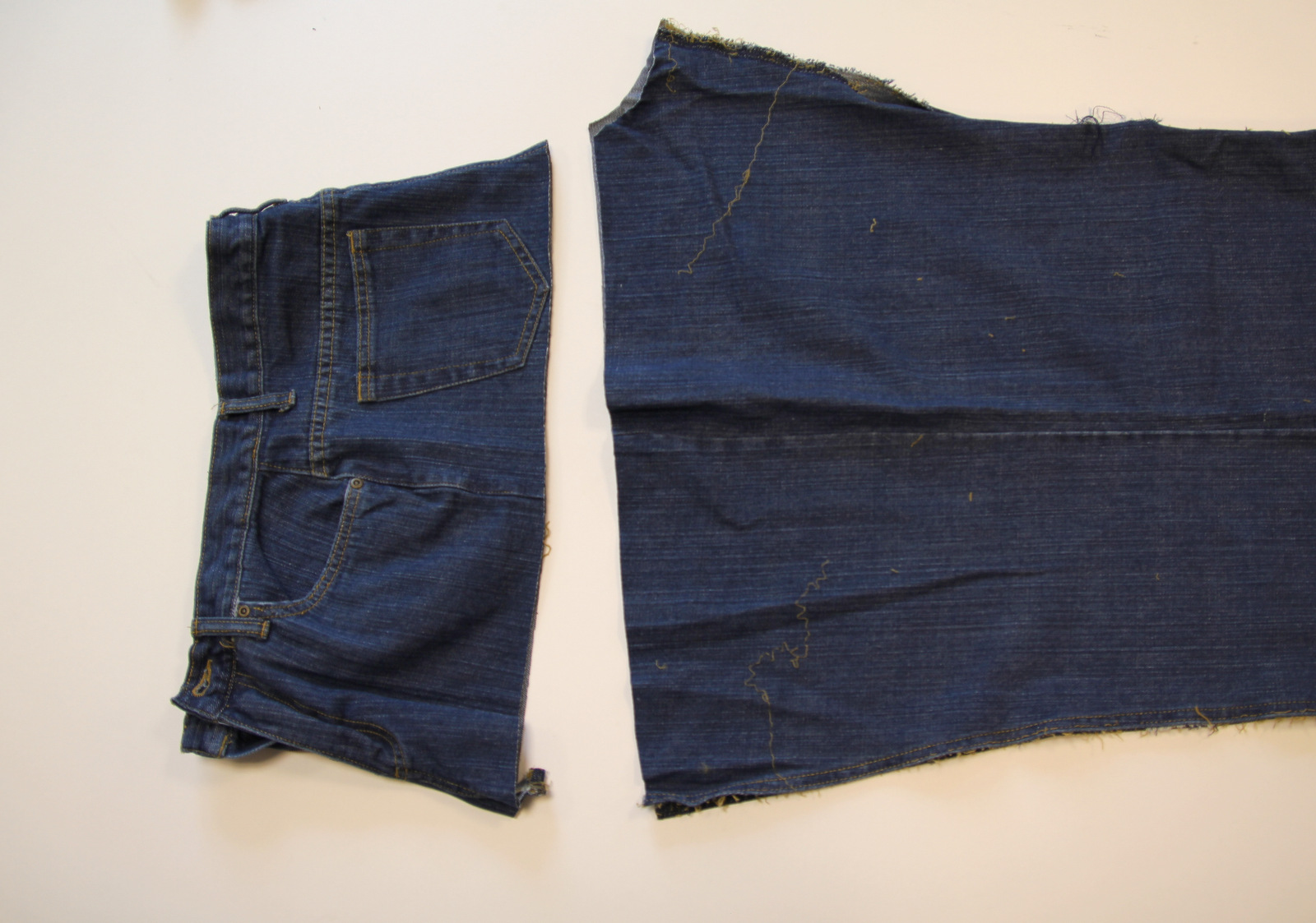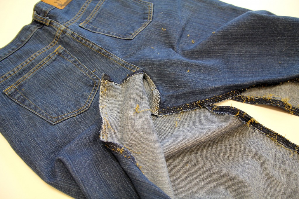 Now take the first pair of jeans and cut the legs off right below the pockets: