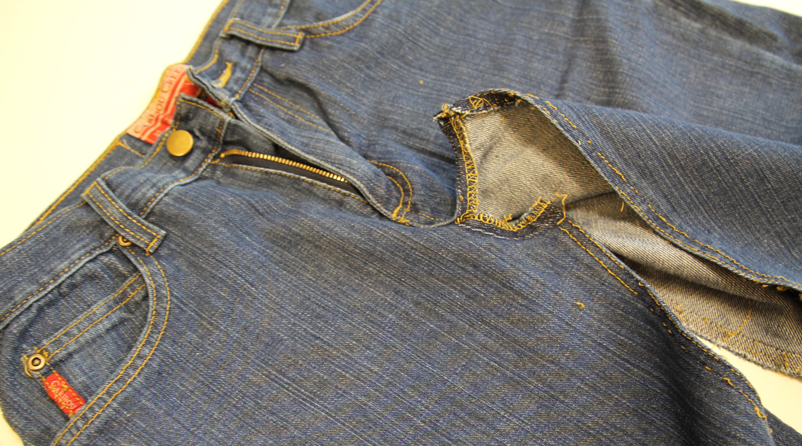 With the second pair of jeans rip-out the front and back seam part way up: