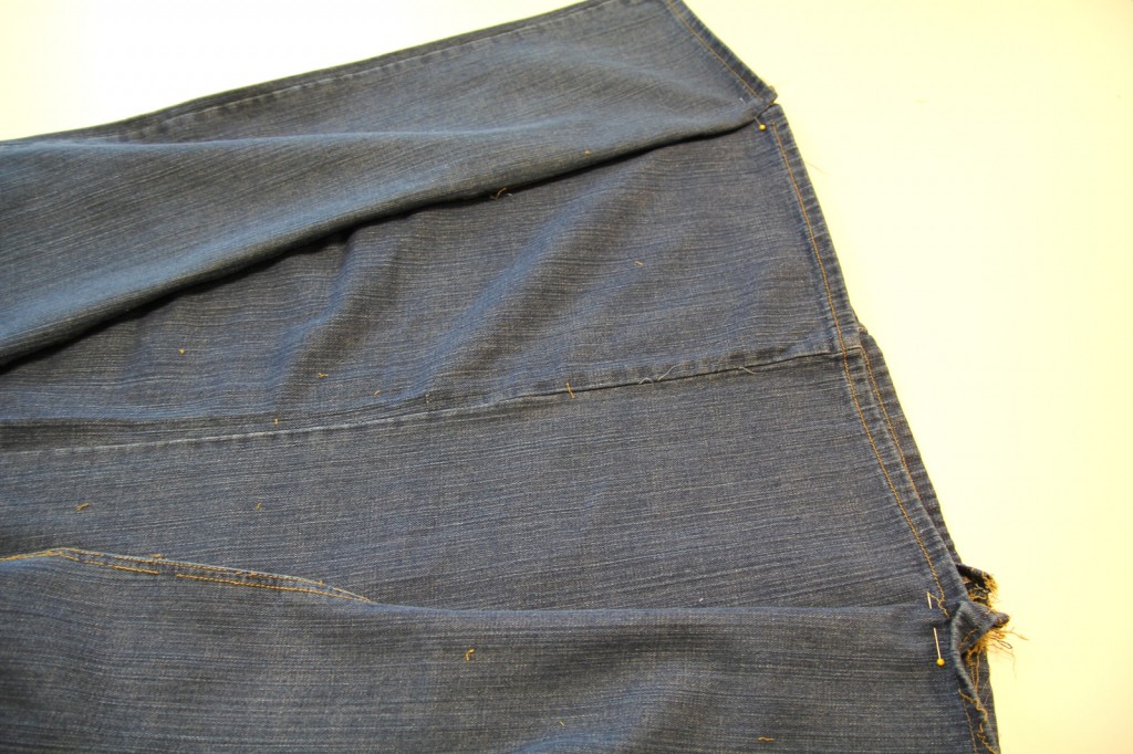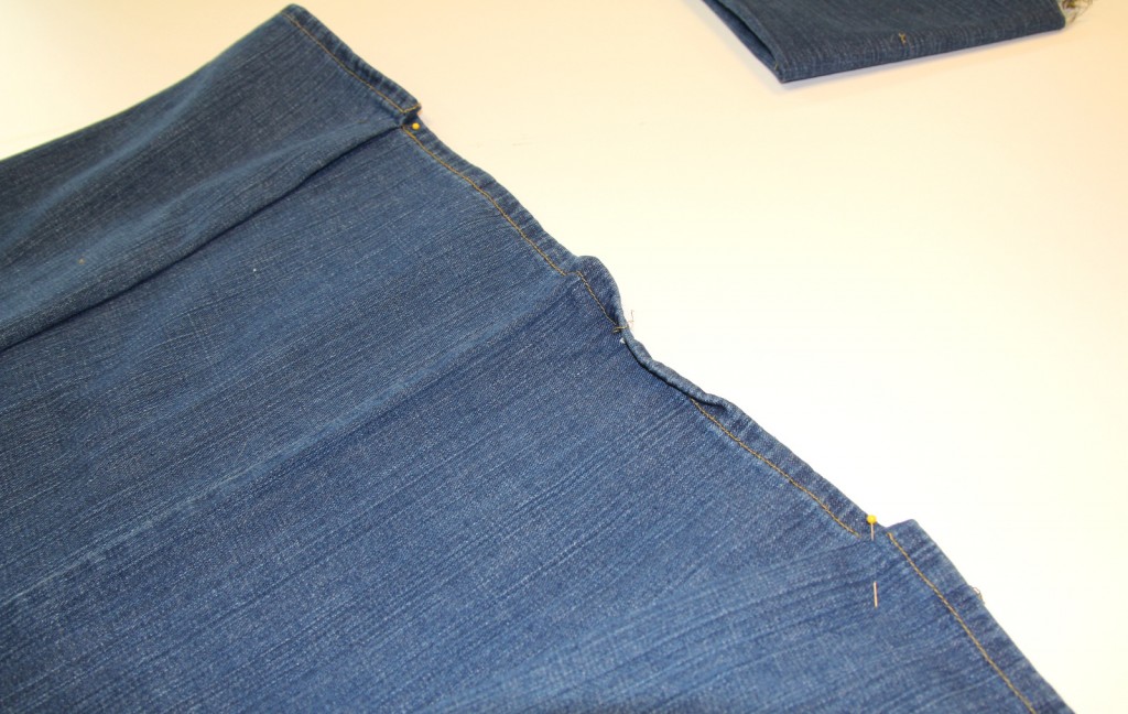 Line up the hem line of the second pair of jeans and leg piece from the first pair and pin it in place: