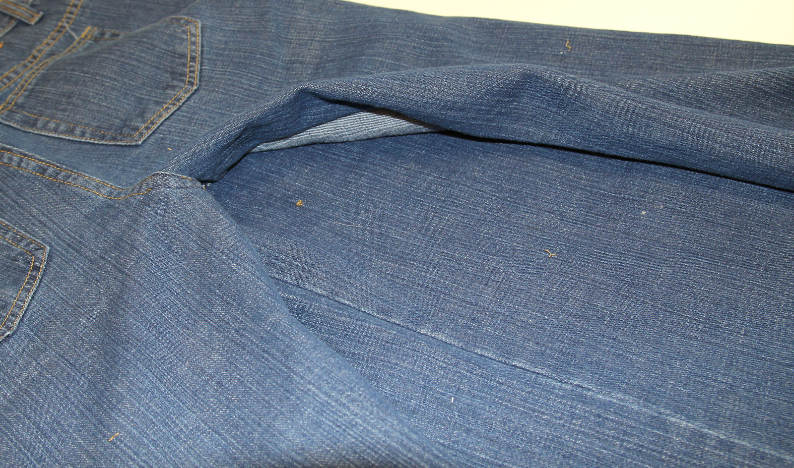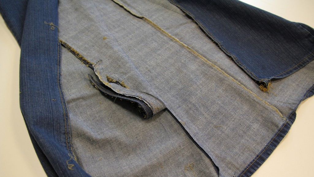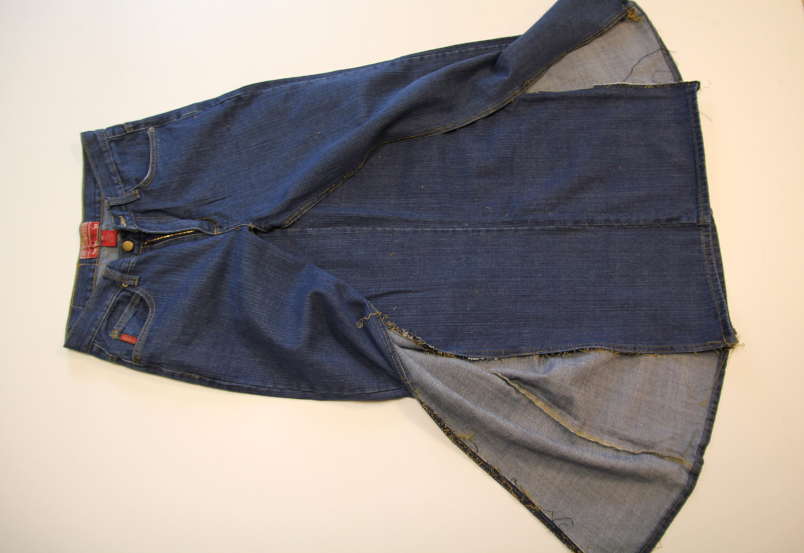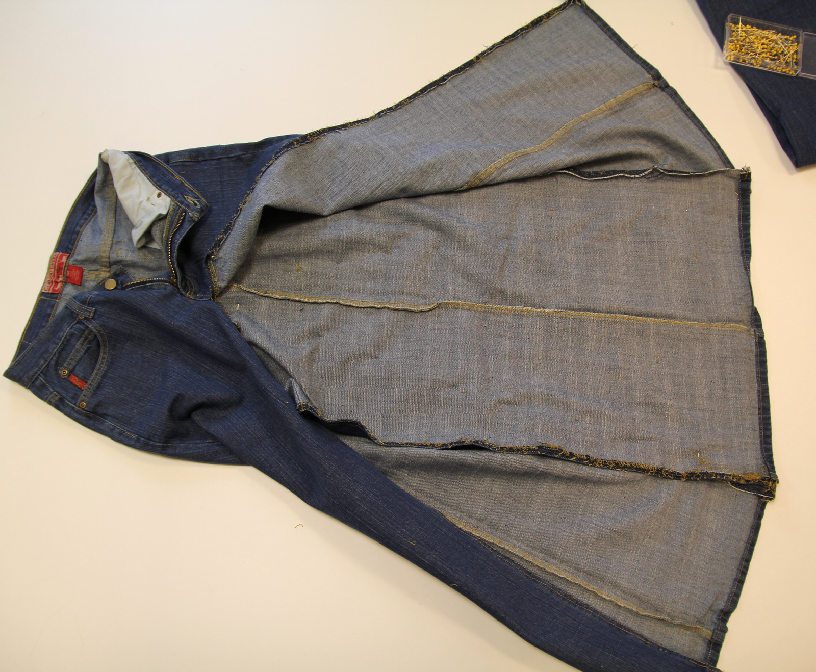 Turn the raw edge of the second pair of jeans to the inside of the skirt: