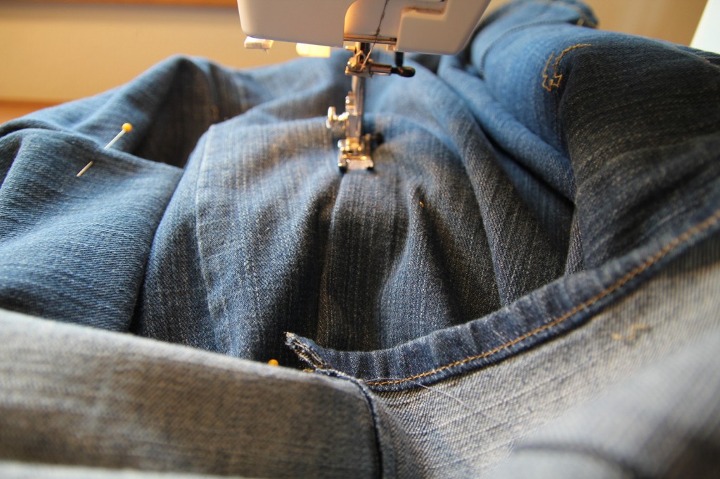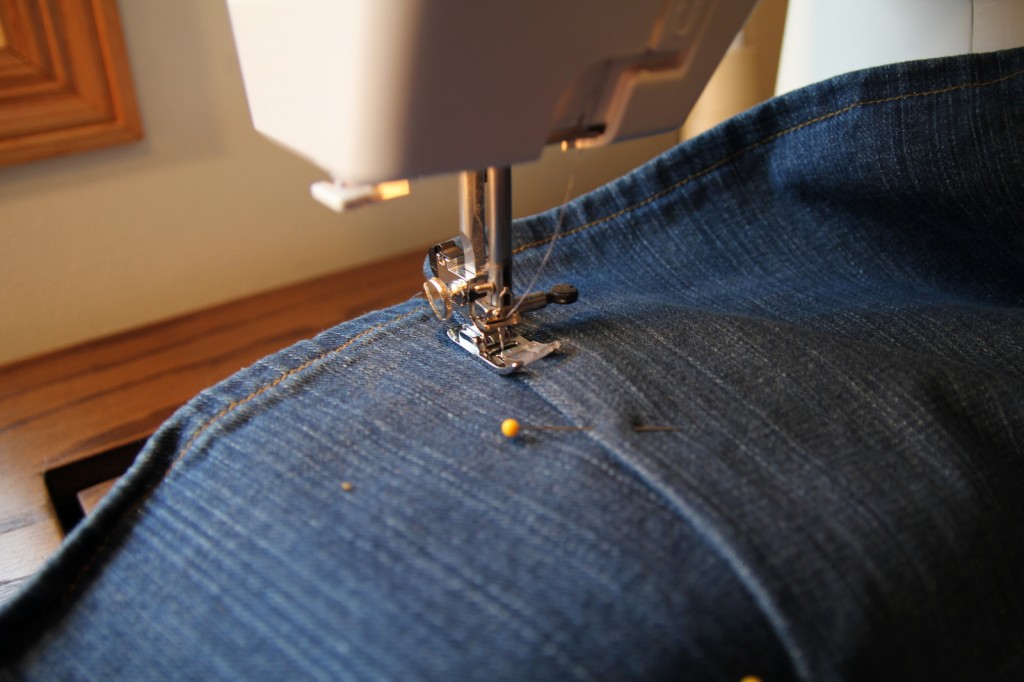 Next sew very closely to the folded edge on the outside of the second jeans: