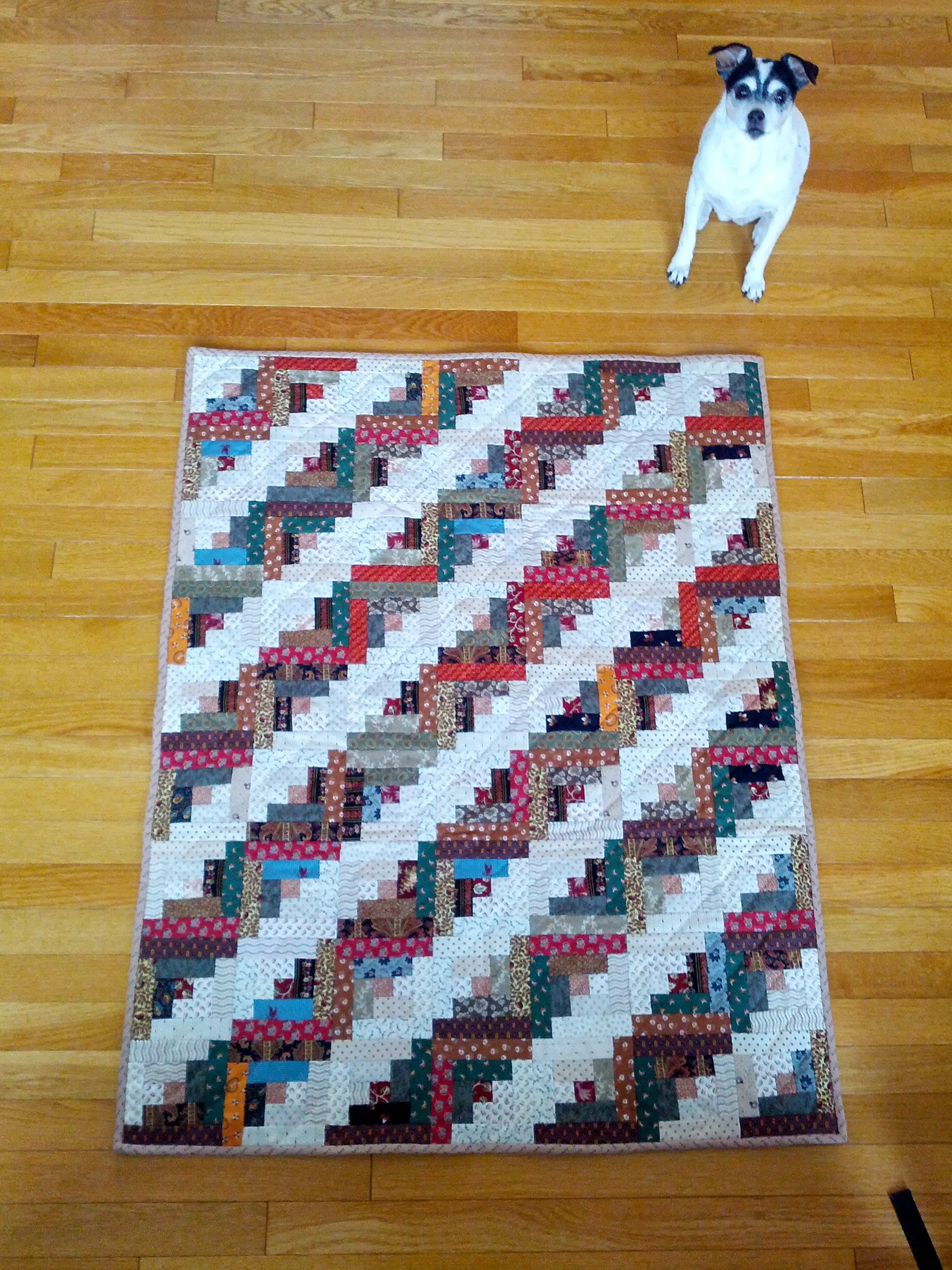 Her quilt. Made from all my reproduction fabric scraps. The blocks were cut at 1 1/2″ squares and finished at 1″. Hand-quilted the layers together.