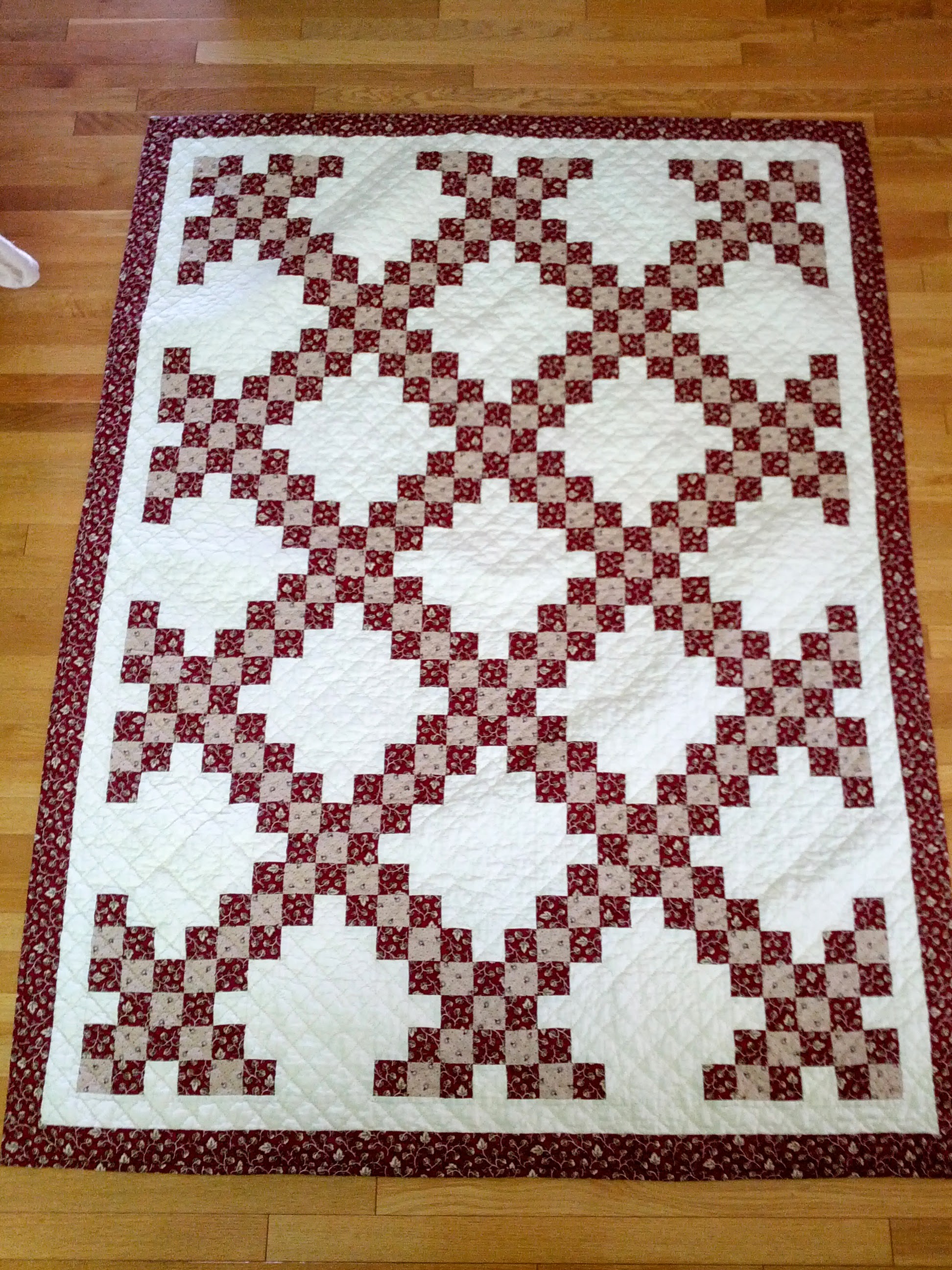 This Irish Chain quilt was made from 1860’s Reproduction fabrics for my sister-in-law for her birthday. I used Eleanor Burns book, Irish Chain in a Day, for a pattern. I made the top from start to finished on January 16, 2015. I finished hand quilting the top the second to last week of April, 2015.