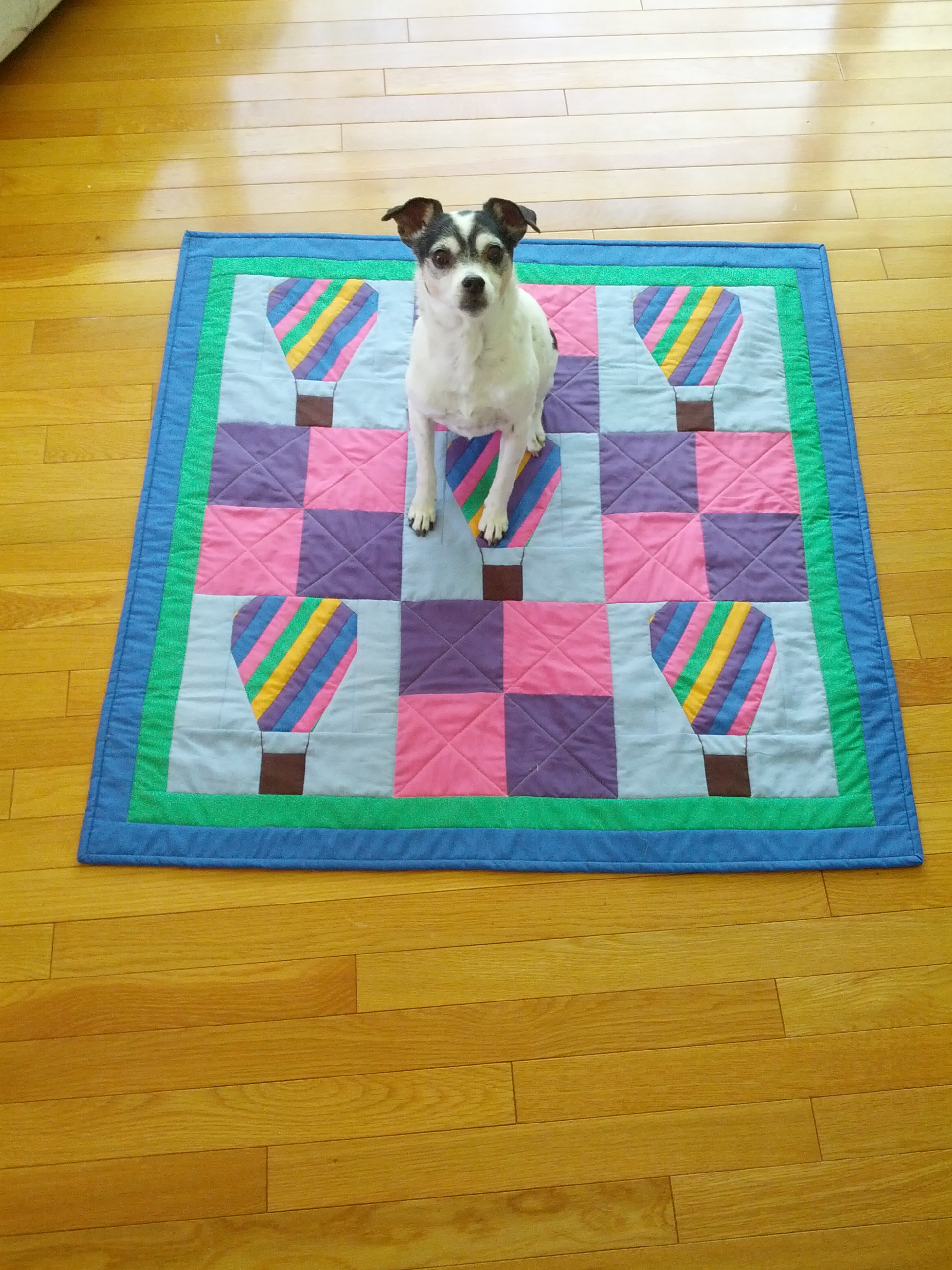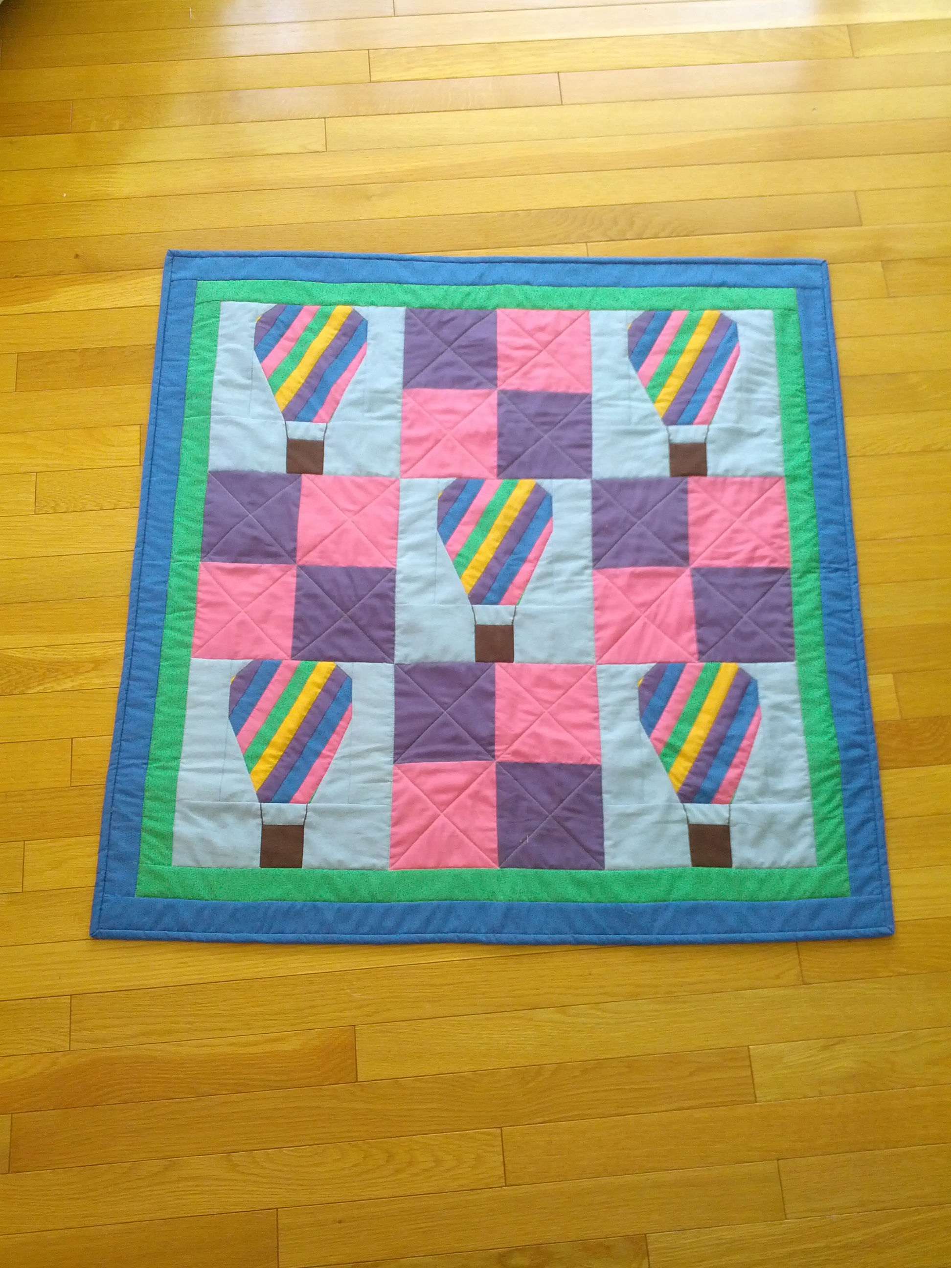 This was made as a gift for my cousin’s little girl. When talking to my cousins wife about what she had in mind for her baby she mentioned hot air balloon. I recalled that my grandmother had some fabric that she was going to use to make a hot air balloon quilt so I used it. I wasn’t sure what pattern my grandma was planning on using, and I couldn’t find one that suited my taste, so I decided to try my hand at designing my own paper-pieced block. This is the result of my first self-designed paper-pieced quilt project.