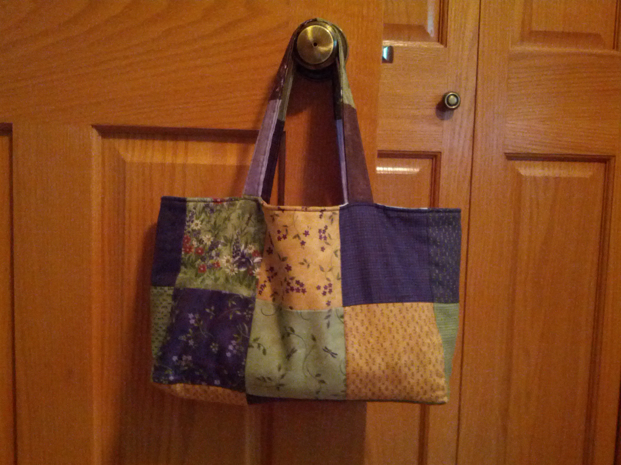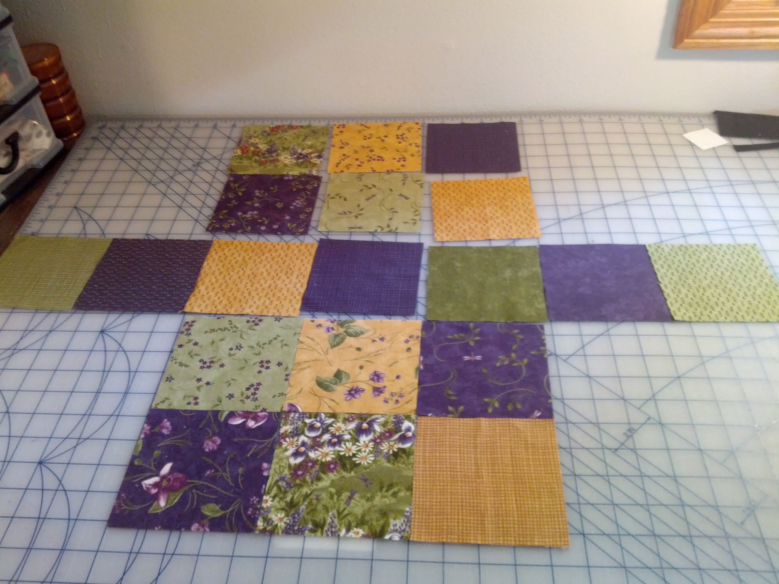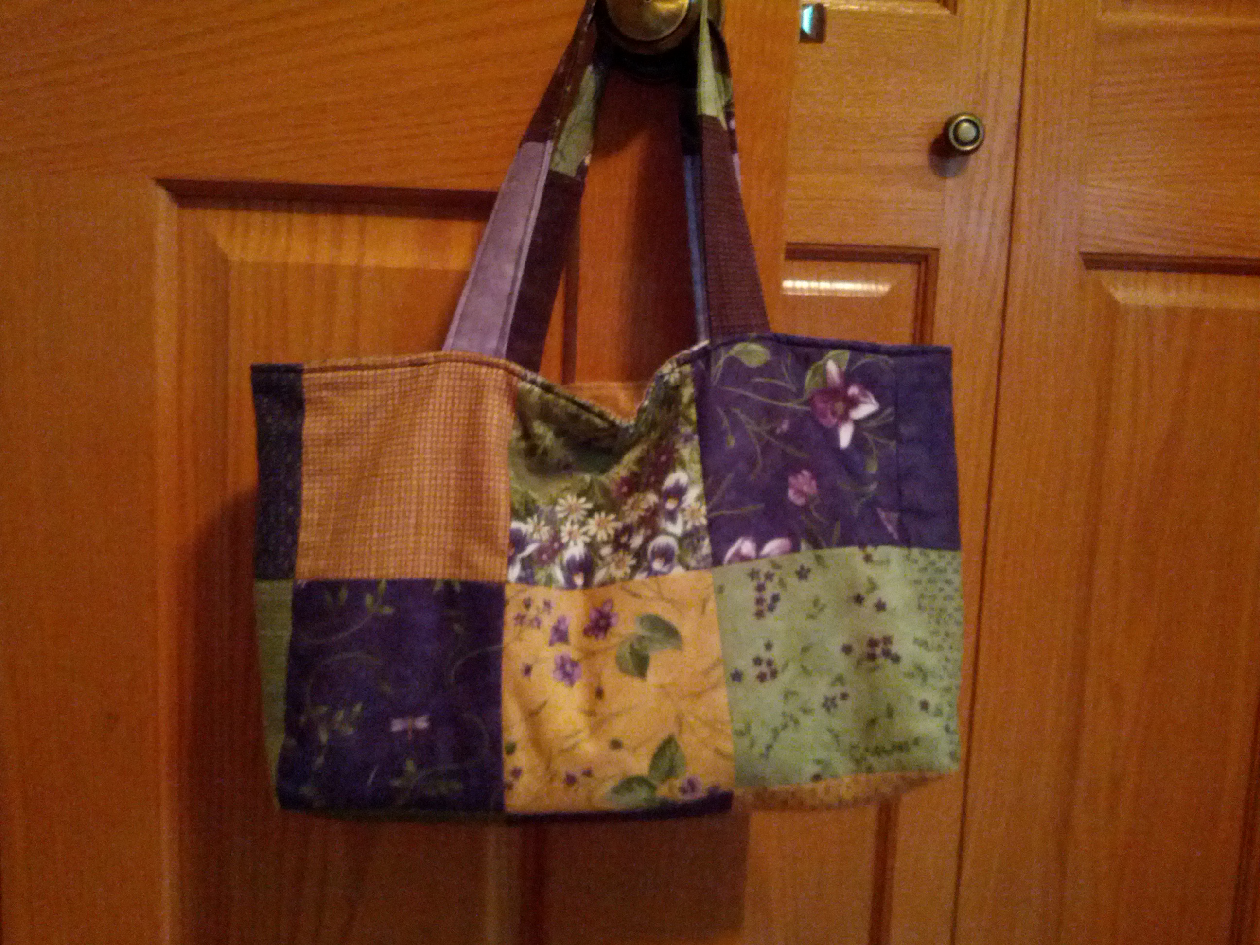 While traveling in northern Minnesota this spring I purchased a charm-pack filled with purple, green, and brown fabric squares. My momma’s favorite color is purple so I figured I would make something for her from it. She had asked a number of times for a new purse so I decided to use the charm-pack and make a purse from it. I cut the blocks down to 4 1/2 inches arranged them how I’d like them for a purse. I was only 3 blocks short for the entire purse so only part of the lining is made from my fabric stash – the rest of the quilt (including the handles which used four squares each) was made from the charm-pack.